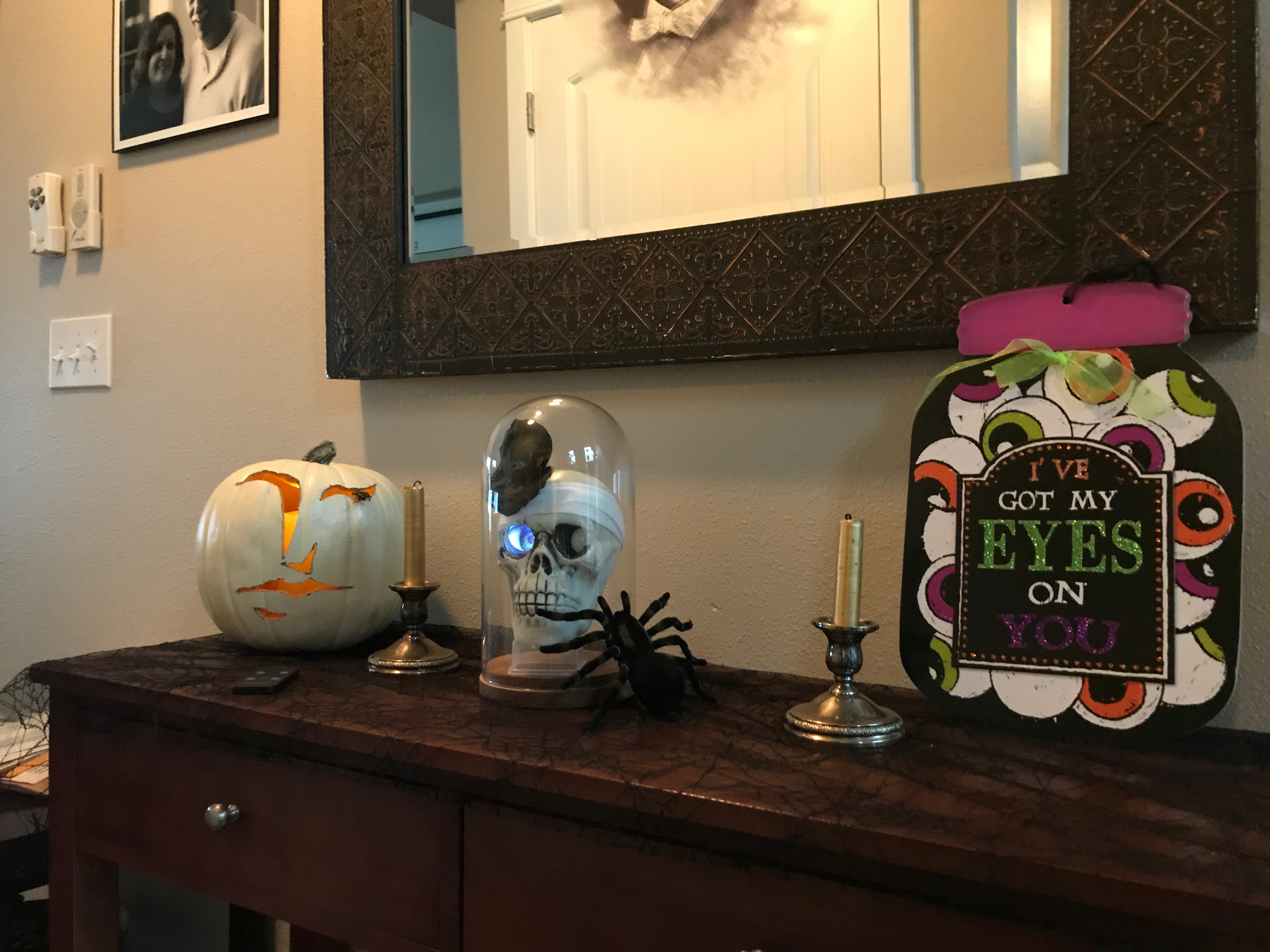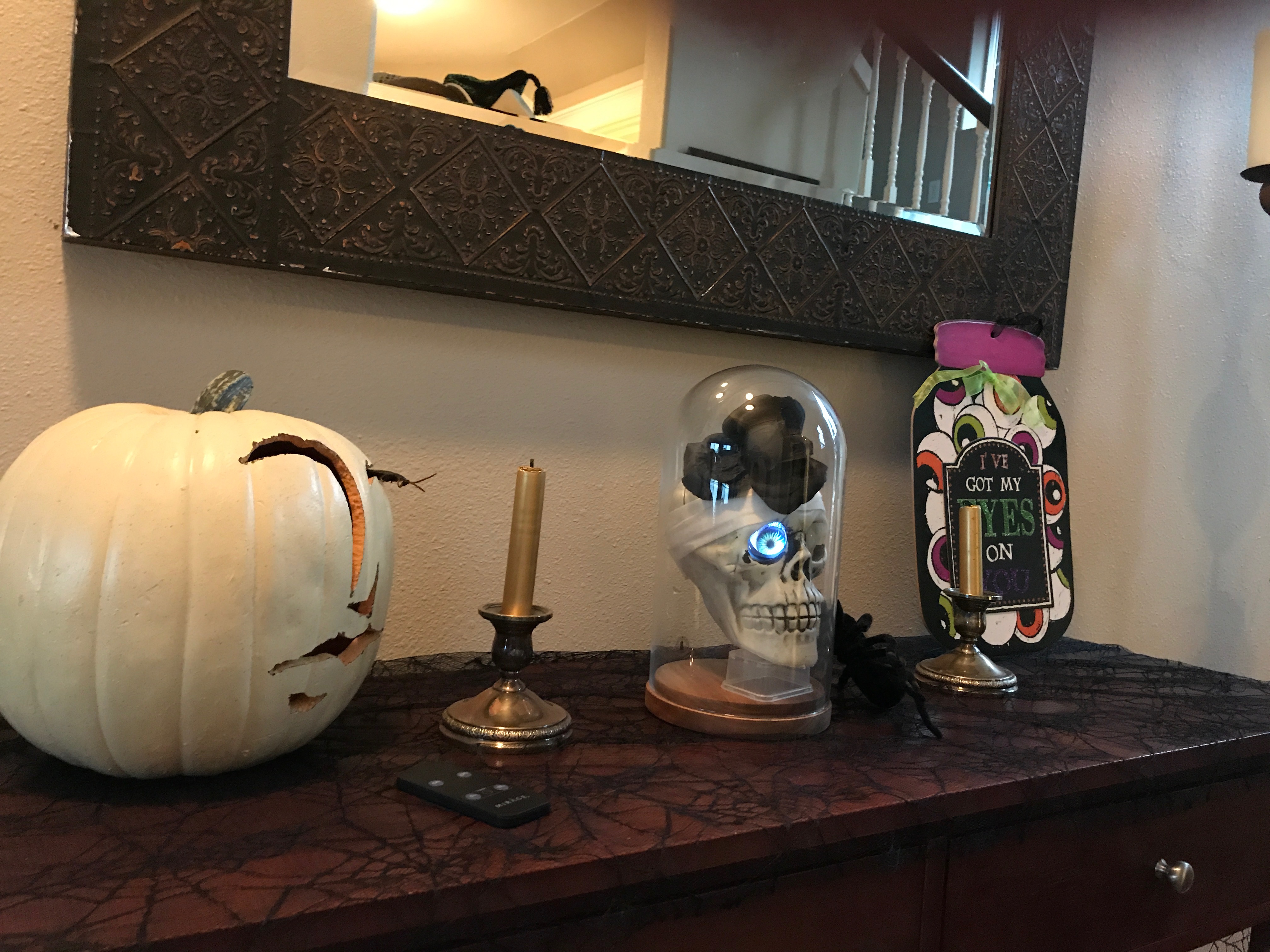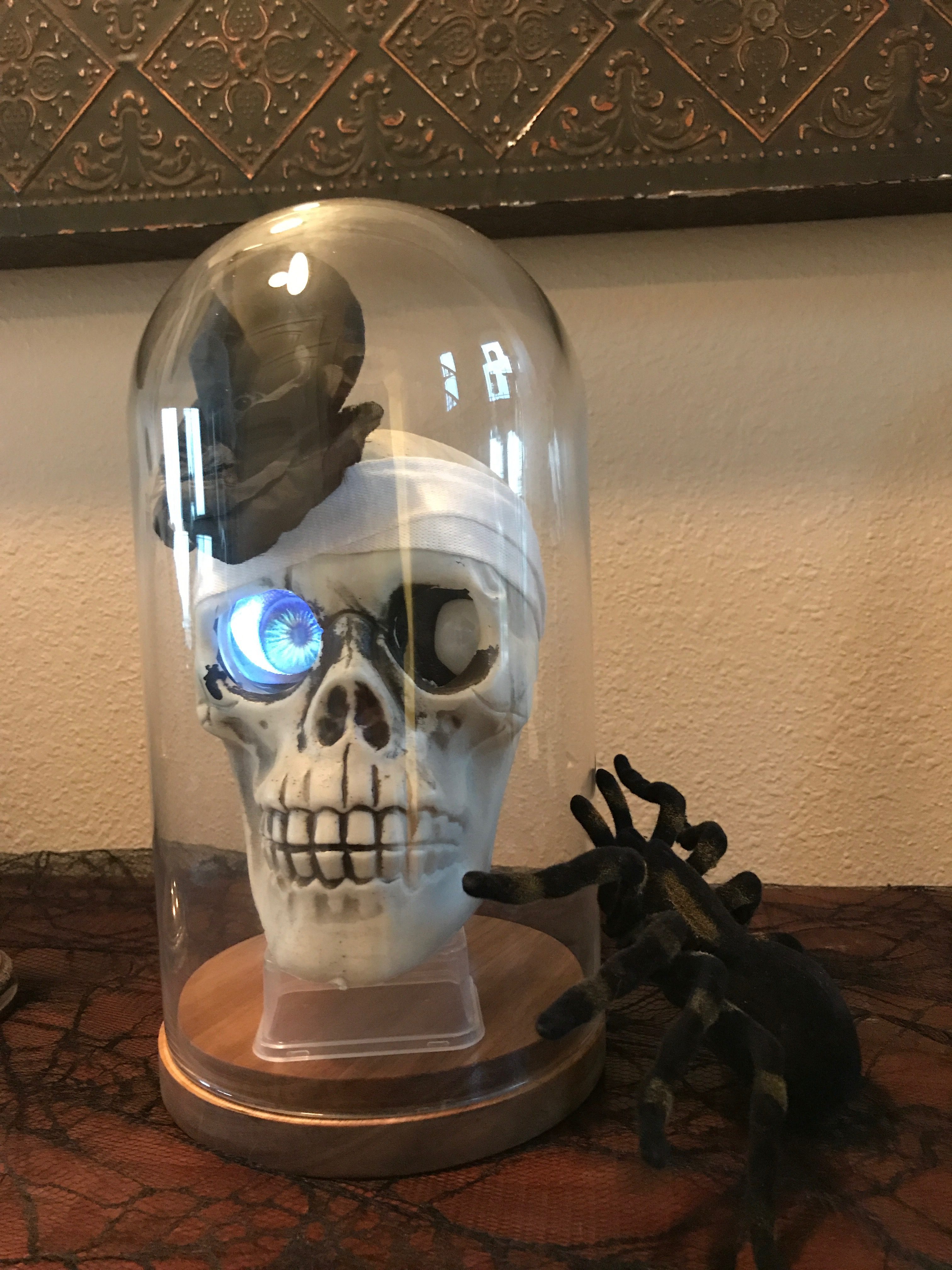 Since I’m a beginner, getting the eyeball to work and installing it into a plastic skull from the dollar store felt like a major accomplishment. Muldar the spider also came from the dollar store and I bought the glass cloche at Ikea. There were some considerations and a few wrinkles to figure out. For example, the motion detector requires a different power source from the Hallowing AND it doesn’t detect motion through the glass of the cloche. But all the info to accomplish and trouble shoot this project was readily available on the Adafruit site and it was so much fun to create a super-cool Halloween with just a handful of supplies and my laptop.